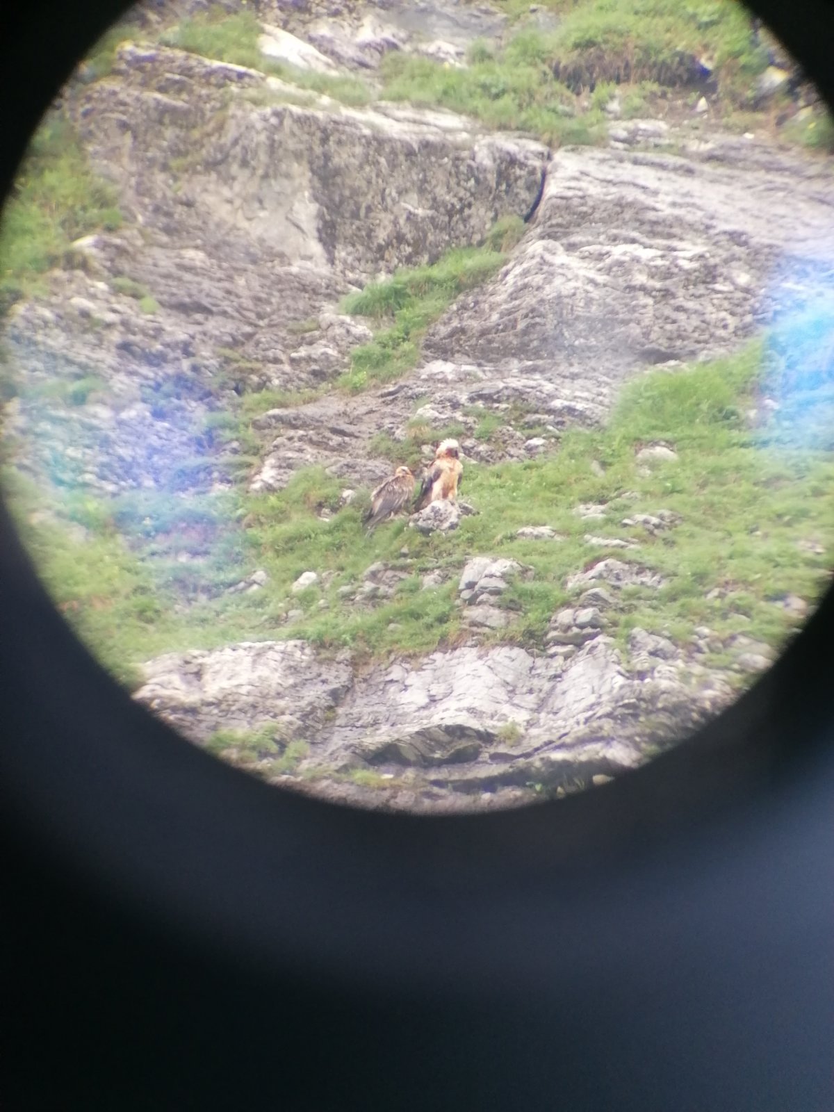C’est un grand oiseau de proie des montagnes, avec des plumes sur le bec. Il mange des os en les faisant tomber des falaises pour les casser. C'est le dernier nettoyeur des cadavres en montagne. Ici, on a eu la chance d'observer 2 individus posés sur la falaise en face de nous, dans le Vallon des Morteys.