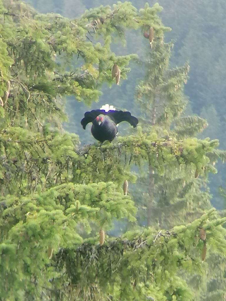 Et le Tétras-lyre est un oiseau un peu spécial, de la famille des poules, qui vit en montagne. Une poule de montagne quoi ! Au printemps, les mâles roucoulent pour attirer les femelles, on entend un peu ce chant particulier sur la vidéo.